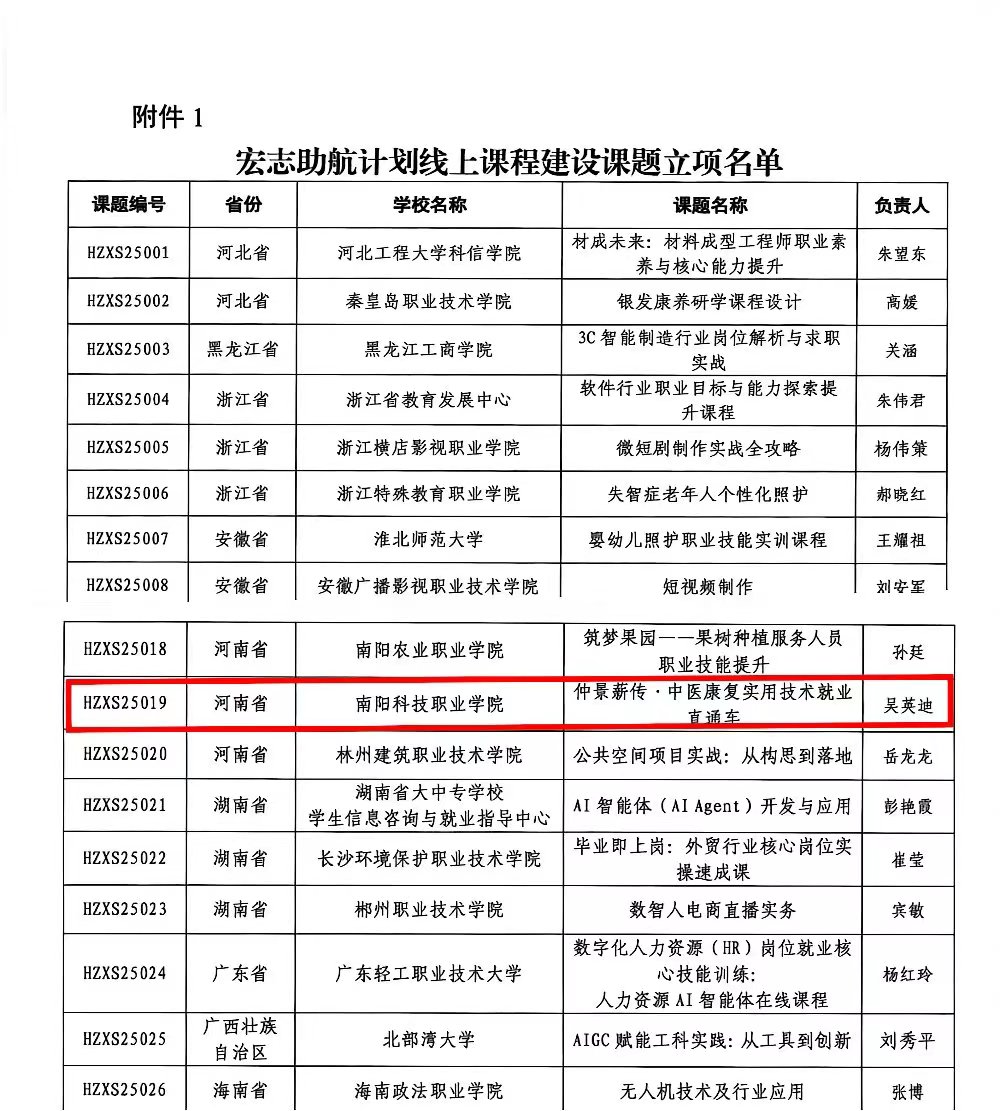 近日,教育部公布2025年“宏志助航计划”线上课程立项名单,全国共立项30个课题,我校《仲景薪传·中医康复实用技术就业直通车》成功入选。这是学校深耕“双高工程”、推进“五金建设”的重要成果,标志着我校在专业群建设、产教融合与就业导向课程体系构建上实现新突破。该课程紧贴市场需求,获得了“河南省教育厅”“河南高教”等省级公众号的充分肯定,彰显了课程的专业特色与建设价值。