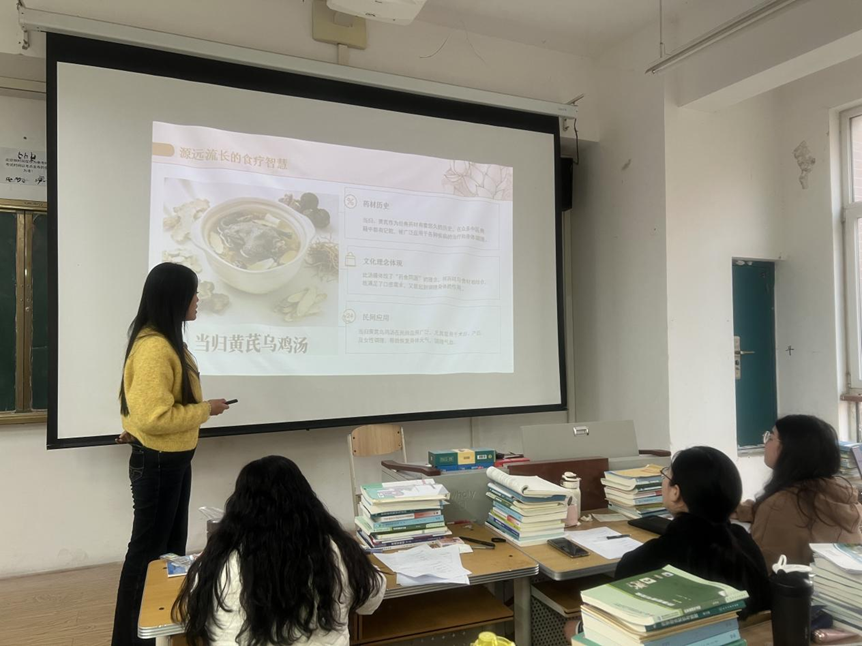 随后,17支队伍按抽签顺序依次登台,以PPT的形式展示了各种独具特色的药膳作品,对药膳组成、性味归经、功效机制、烹制流程等进行详细介绍,既有 “黄芪枸杞乌鸡汤” 这类承载千年经验的经典药膳,也有 “陈皮柠檬气泡饮”“山药紫薯糕” 等融入现代元素的创新组合,每一份作品都凝聚着学子对中医药文化的深刻体悟与独特创见,赢得台下阵阵掌声。由教务科及药学教研室组成的评委团,围绕内容准确性、讲解表现、团队协作等维度进行现场打分点评,既肯定了各团队的亮点特色,也针对专业知识细节提出了改进建议。