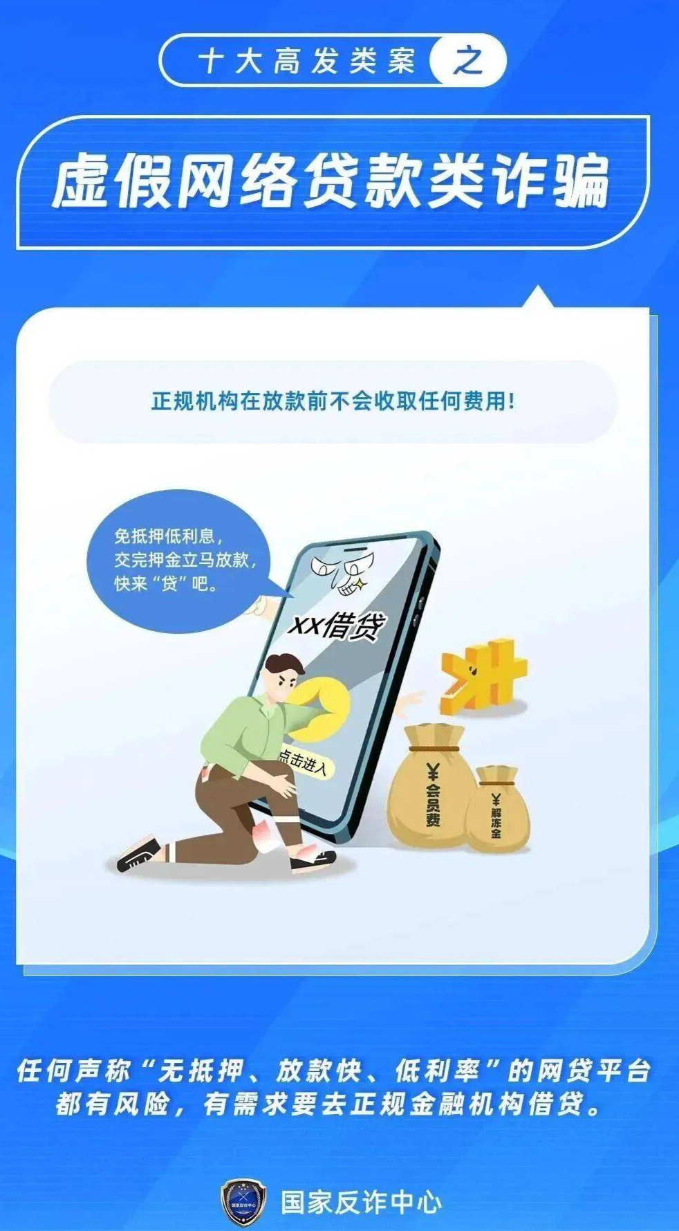 部分同学假期有消费需求,可能会遇到资金短缺的情况,诈骗分子便瞄准这一需求,推出“无抵押、低利率、秒到账”的网络贷款服务。但实际上,他们会在放款前以“手续费”“担保费”“解冻费”等名义要求你先转账,转账后便失联;还有部分诈骗分子冒充“校园贷注销专员”,声称“你的校园贷记录未注销,影响征信”,要求你转账“注销费”,实则纯属骗局。
