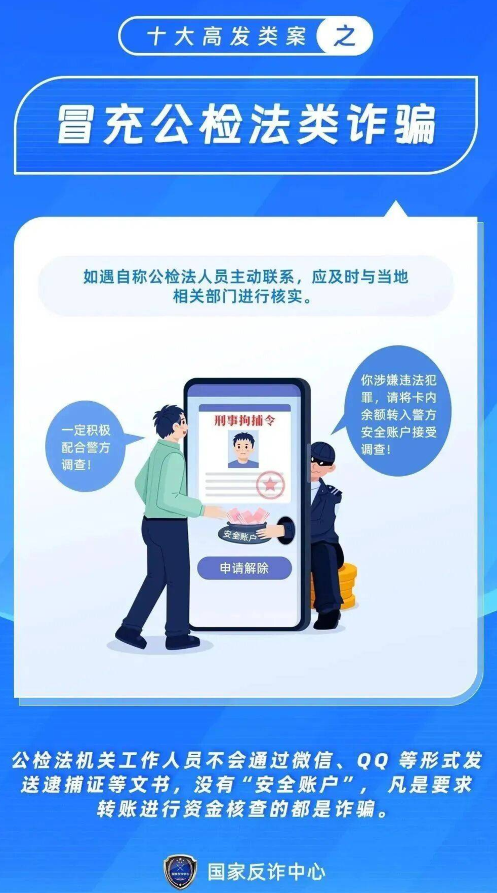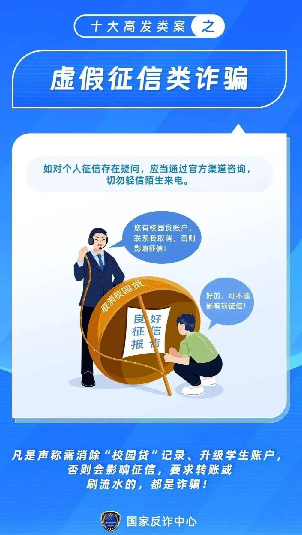 冒充公检法诈骗:通过电话、短信冒充警察、检察官,声称你“涉嫌洗钱”“征信有问题”“涉嫌违法犯罪”,要求你将资金转入“安全账户”配合调查,或提供个人敏感信息,利用大学生的恐慌心理实施诈骗。