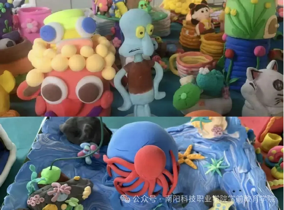 黏土作品区,一个个解压小天地令人驻足。造型各异的黏土庄园,红瓦白墙,庭院深深;广袤的黏土牧场里,牛羊成群,悠然自得。色彩斑斓的鸟儿展翅欲飞,灵动的鱼儿在“水中”嬉戏,动画人物海绵宝宝、小英雄哪吒、哆啦A梦也被同学们塑造得栩栩如生,作品细节之处尽显学前教育学院学生们的匠心独具。