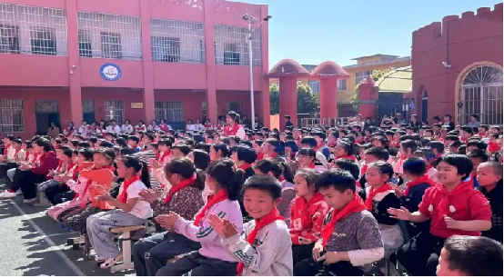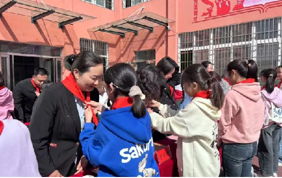随后,陈岗小学的学生代表们手捧着鲜艳的红领巾,迈着略显紧张却又无比坚定的步伐走向领导和嘉宾。他们仰着稚嫩的脸庞,眼神中满是纯真与崇敬,小心翼翼地为既是嘉宾又是“爱心”妈妈的领导、老师们系上红领巾。微风轻拂,红领巾随风飘扬,恰似孩子们炽热的内心,那一抹鲜艳的红,传递着孩子们对知识的渴望,也连接起了彼此内心油然而生的那份亲情。