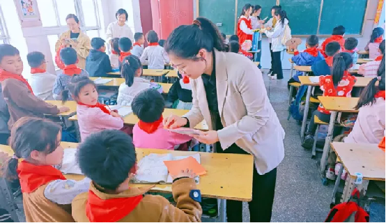 表演结束后,在朱书记的指导下,志愿者们分成小组,带着精心准备的教学材料和满满的爱心走进各个班级。作为学前教育专业的学生,他们充分发挥专业优势,将趣味与知识巧妙融合。志愿者们拿出了色彩斑斓的彩纸、造型可爱的小玩偶等手工作品,刹那间就吸引了孩子们的注意力,激发了他们的好奇心和创造力。在志愿者们耐心细致的指导下,孩子们拿起画笔、彩纸,认真构思,大胆创作,不一会儿,一幅幅充满童趣、饱含奇思妙想的作品便诞生了。