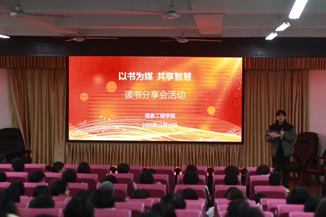 以书为舟,畅游知识海洋;以文会友,共享阅读之乐。近日,信息工程学院“以书为媒,共享智慧”读书分享会于三师苑圆满举行。活动聚焦经典书目品读与思想交流,为学子搭建展示阅读收获、传递书香力量的平台,旨在引导同学们深耕阅读,在经典中汲取成长养分,在分享中碰撞思想火花。学院党支部书记狄敏、学生科科长刘净宇、25级全体学生共同参与了本次读书分享会。
