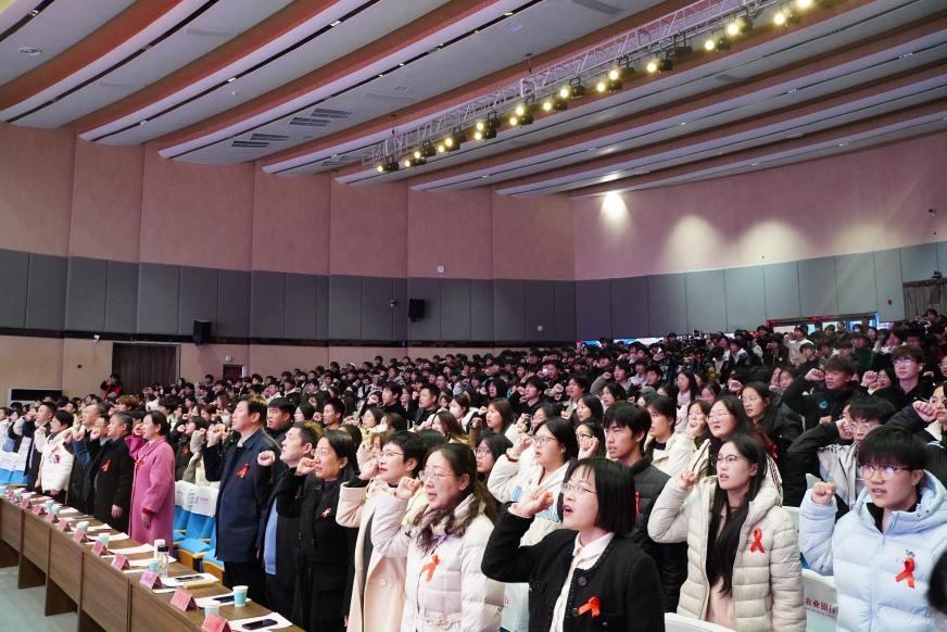 活动中穿插了有奖问答环节,同学们踊跃参与,现场气氛十分热烈。临近尾声时,校团委书记带领全体师生起立宣誓,承诺将积极向社会大众传递防艾知识,切实履行“关爱生命、消除歧视、科学防艾”的责任。