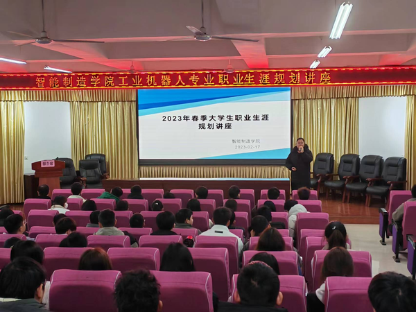 为进一步普及大学生职业生涯规划理念,提升学生的职业素养和就业能力,2月17日下午,智能制造学院邀请校企合作单位广东拓野教育投资有限公司的两位教师,分别对工业机器人专业和新能源汽车专业的学生进行职业生涯规划讲座。