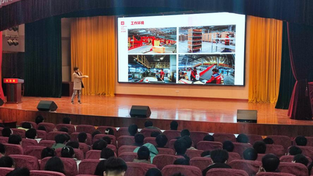 会上,京东集团华中人事李高飞同学们介绍了京东集团的成长经历、发展前景、实习及工作岗位需求等内容,鼓励我校学生努力争取实习、工作机会,敢于在工作发挥自身长处和优点,展示自己才能